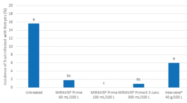 No disease was detected after treatment with Miravis Prime at 100 mL/100 L compared to 6 per cent of fruit infected after treatment with an industry standard.