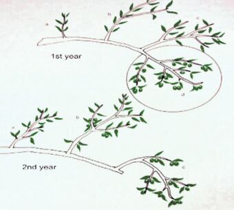 The age of the canopy and productivity of the twigs can be determined by where the fruit develops in relation to the length of the fruiting branch.
